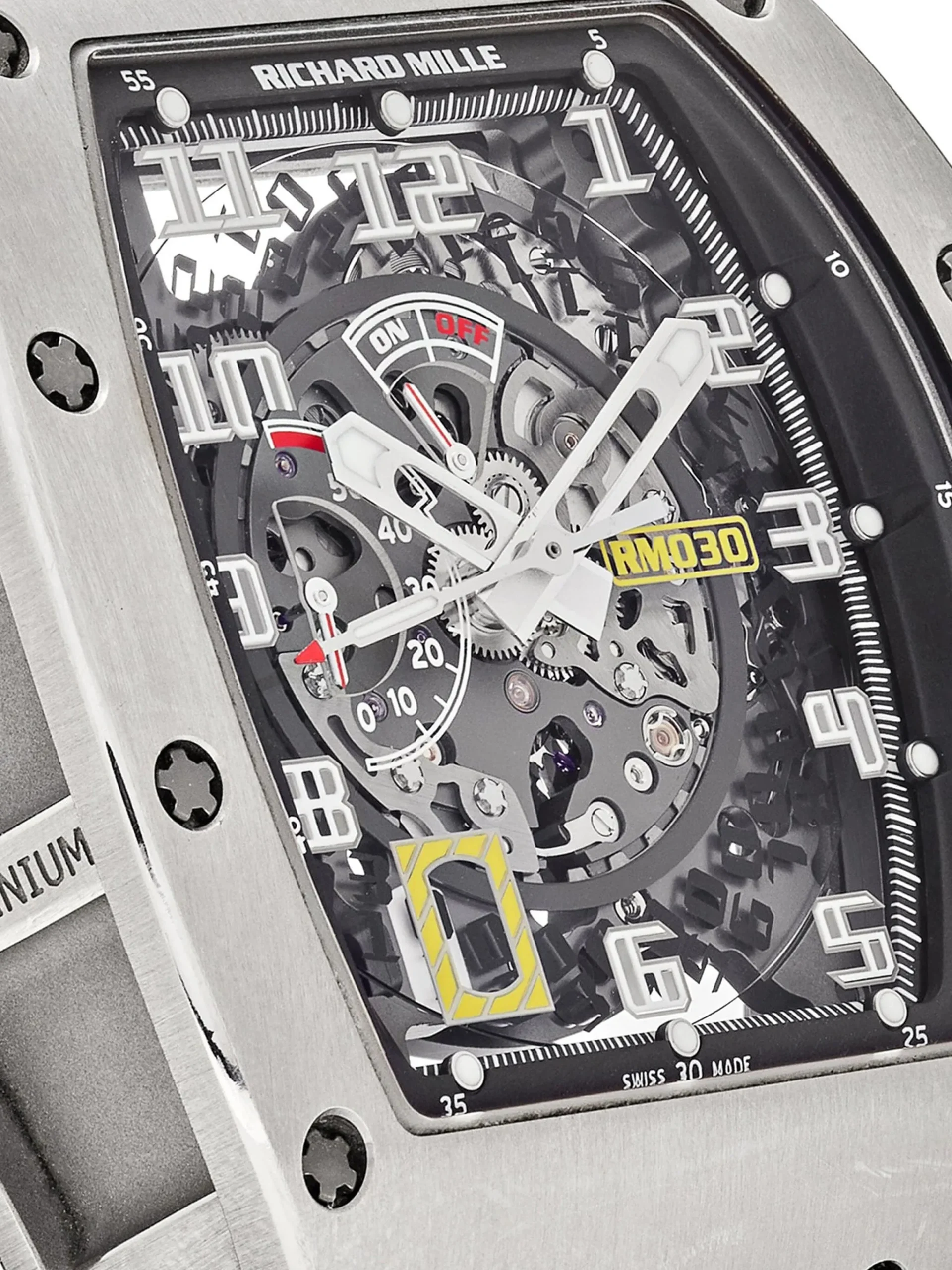 What sets the RICHARD MILLE RM 030 42mm apart is the innovative self-winding movement that operates with optimal efficiency, thanks to the groundbreaking declutching rotor mechanism. This feature ensures the movement is protected from excessive winding, demonstrating technical prowess suited to high-performance timepieces. With a striking 42mm case crafted from premium materials, the watch combines durability and elegance effortlessly. Its bold yet minimalist dial design features distinct indices and hands for enhanced readability, while the skeletonized elements showcase the mechanical brilliance inside.