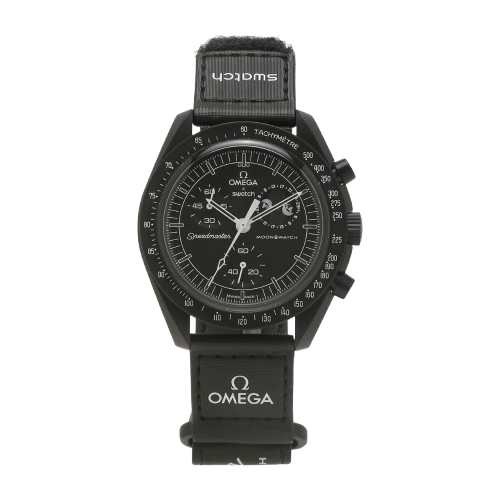 Crafted with an advanced bioceramic material, the SWATCH X OMEGA MoonSwatch combines lightweight wearability with impressive durability. The black case exudes sophistication, ensuring the watch looks sharp on any wrist while being tough enough to handle daily wear. The bioceramic design not only reduces environmental impact but also redefines comfort for the modern wearer.
